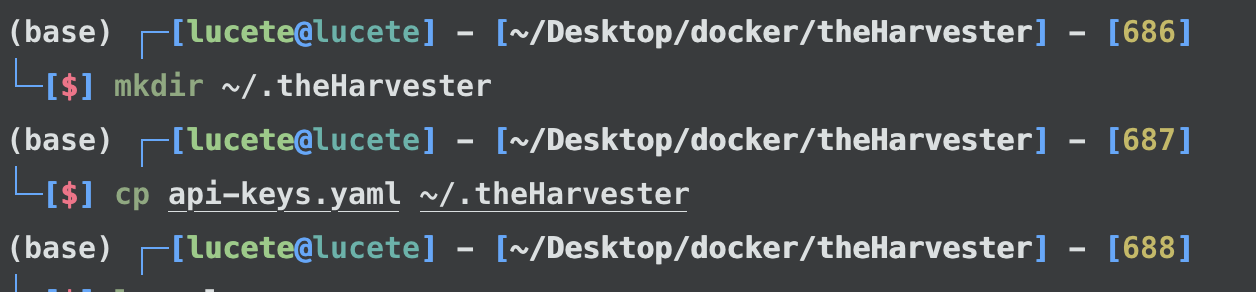 cp api-keys.yaml ~/.theHarvester // ๊ธฐ์กด์ theHarvester ํด๋์์ api-keys.yaml ํ์ผ์ ์๋ก๋ง๋ .theHarvester ํด๋๋ก ๋ณต์ฌ