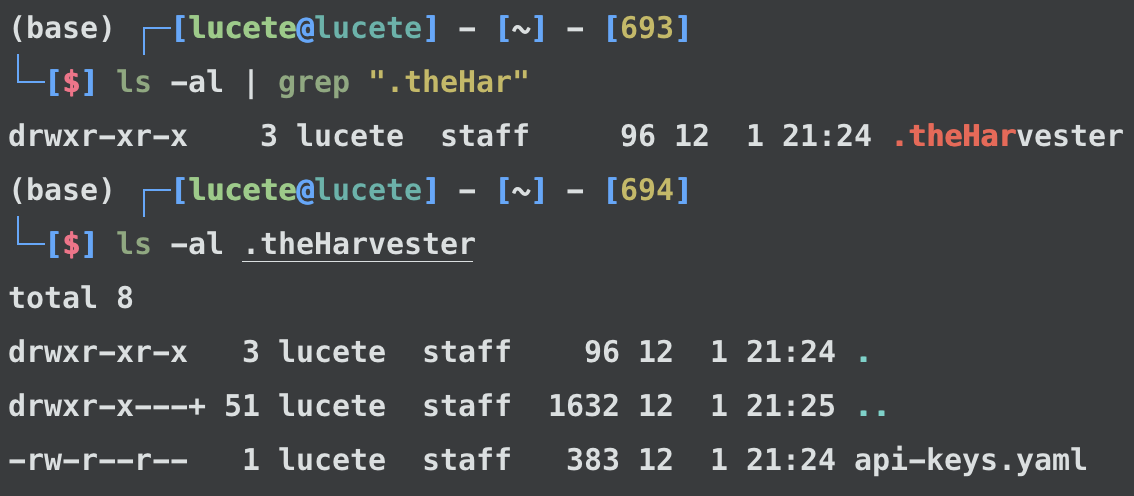 mkdir ~/.theHarvester // home ๊ฒฝ๋ก์ .theHarvester ํด๋ ์์ฑ(.์ผ๋ก ์จ๊นํด๋๊ฐ ๋์ด ํ์ธ ํ๊ธฐ์ํด ls -al์