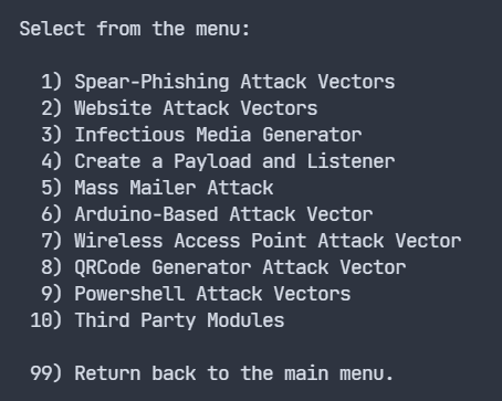 ๋ฉ๋ด๋ฅผ ํ์ธํ๋ฉด ์ฐ๋ฆฌ๋ Social-Engineering Attacks๋ฅผ ์ฌ์ฉํ ๊ฒ์ด๋ค. ๊ทธ๋ ๊ธฐ์ 1์ ์ ๋ ฅํ๋ค.