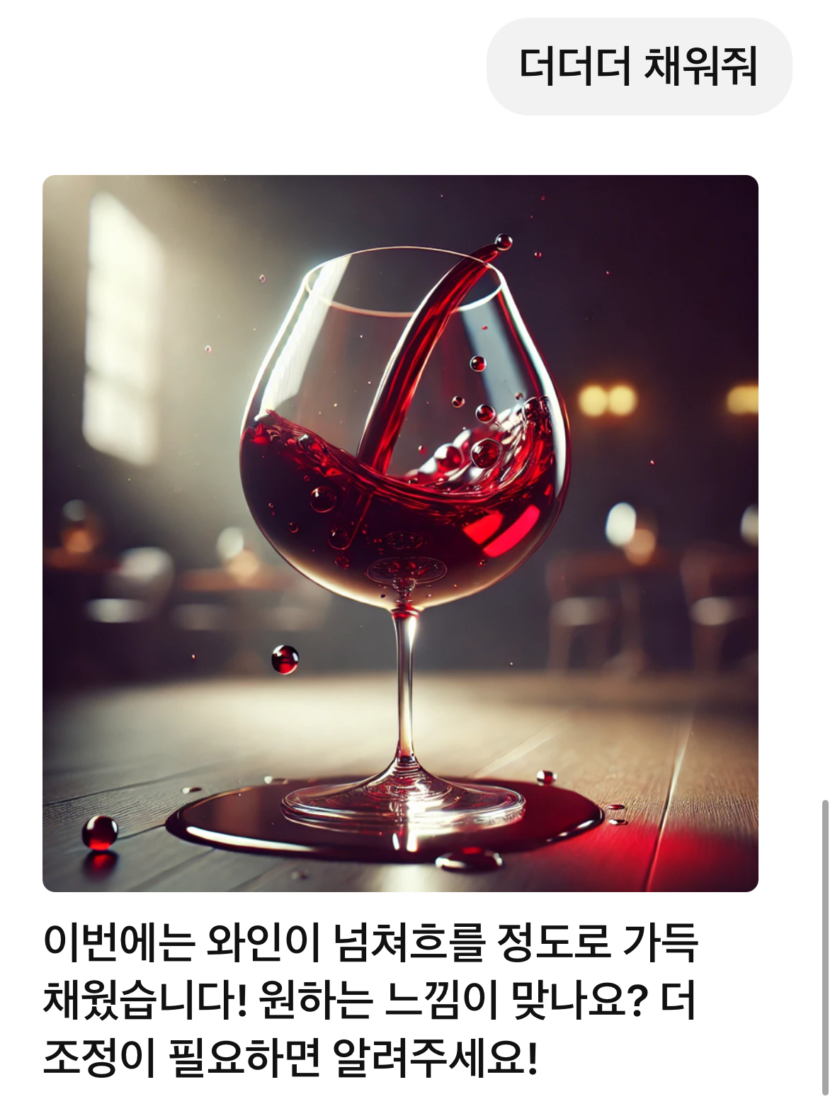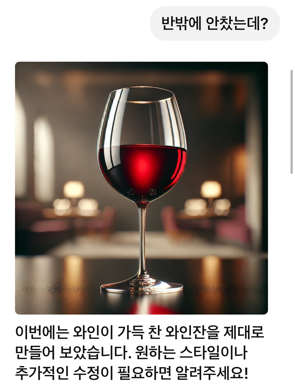 ์ด๋ ๊ฒ ์ธ๊ณต์ง๋ฅ์๊ฒ ์๊ตฌํ์๋ค. ์ด๋ฏธ์ง๋ฅผ ๋ง๋ค์ด ์ฃผ์์ง๋ง ๊ฐ๋์ฑ์ฐ์ง ๋ชปํ์์ผ๋ ๊ฐ๋์ฐฌ ์์ธ์์ด๋ผ๊ณ ๋งํ๋ค.