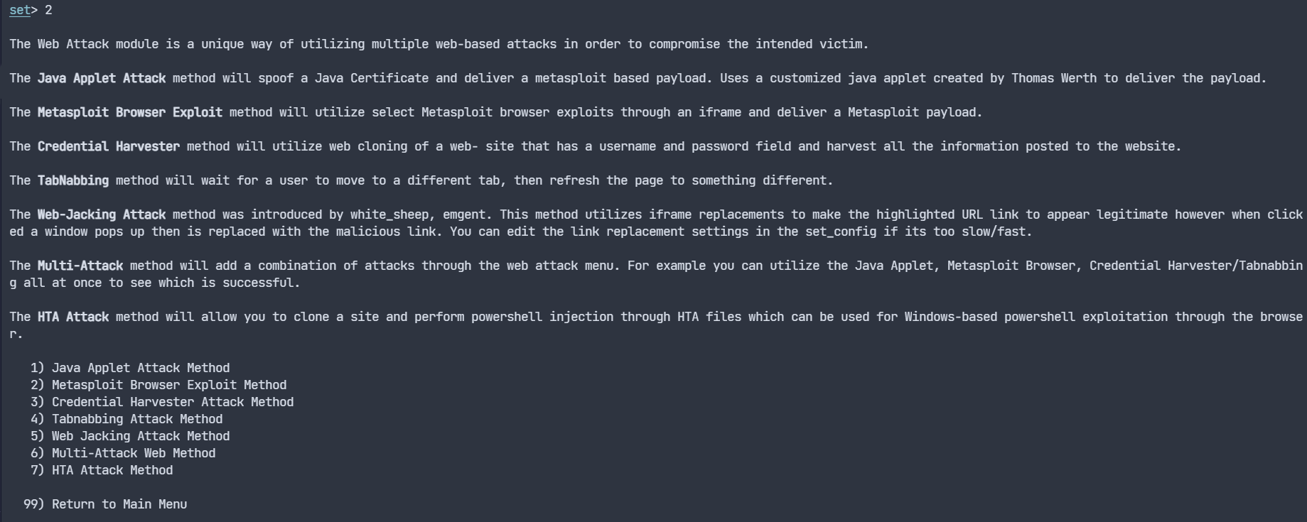 ๋ฉ๋ด๋ฅผ ํ์ธํ๋ฉด ์ฐ๋ฆฌ๋ Social-Engineering Attacks๋ฅผ ์ฌ์ฉํ ๊ฒ์ด๋ค. ๊ทธ๋ ๊ธฐ์ 1์ ์ ๋ ฅํ๋ค.