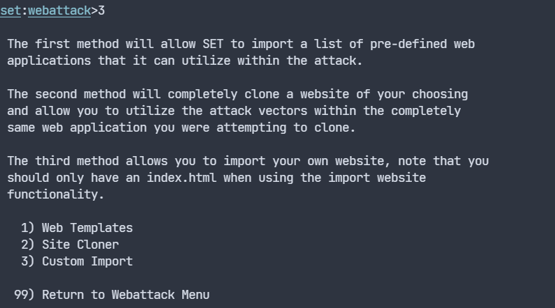 ๋ค์ ๋ฉ๋ด๋ฅผ ํ์ธํ๋ฉด ํผ์ฑ์ ํ๋ ์ด์ ๋ ์ ๋ณด๋ฅผ ํ์ทจํ๊ธฐ ์ํจ์ด๊ธฐ ๋๋ฌธ์ Credential Harvester Attack Method ์ธ 3๋ฒ์ ์คํํ ๊ฒ์ด๋ฉฐ, ๊ฐ์ง ์ฌ์ดํธ๋ฅผ ๋ง๋ ๋ค. ์ฌ๊ธฐ์ ํ์ธ์ ํด๋ณด๋ฉด